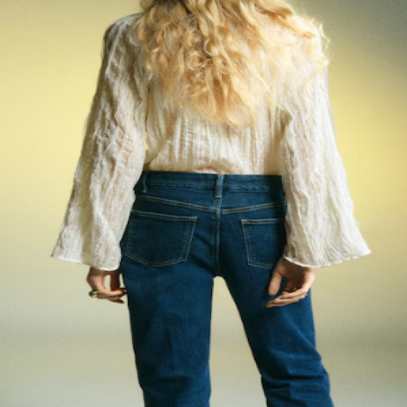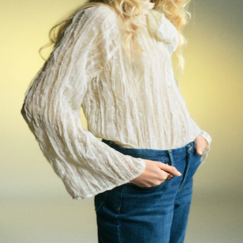 Dokulu kumaştan üretilmiş bu ürün, baü detayıyla süslenmiş yüksek bir yaka ve uzun, volanlı kollarla tamamlanan düz bir tasarıma sahiptir