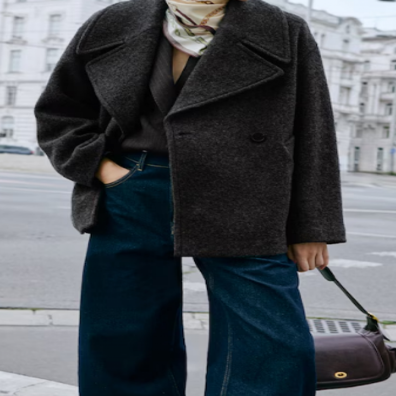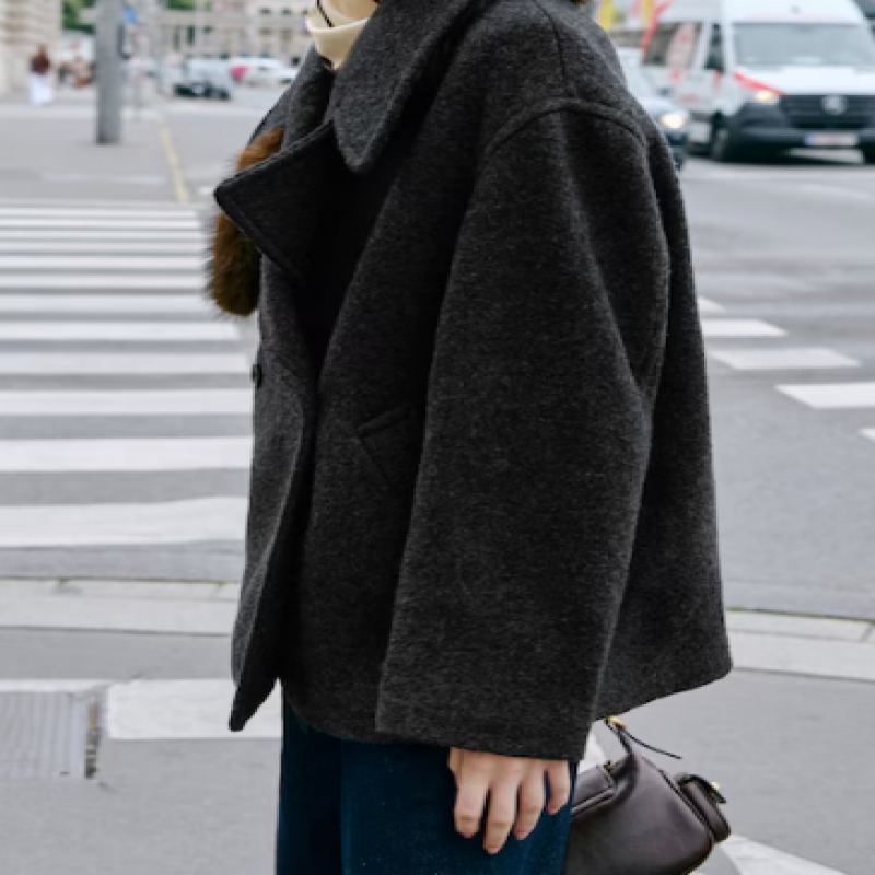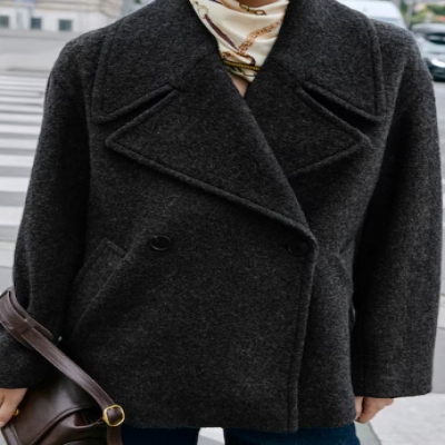 Karma yün kumaşlı. Kısa tasarım. Oversize tasarım. V kesim yaka. Devrik yakalı. Uzun kollu. İki yan ribana cep. Kruvaze kapamalı. İç astar.