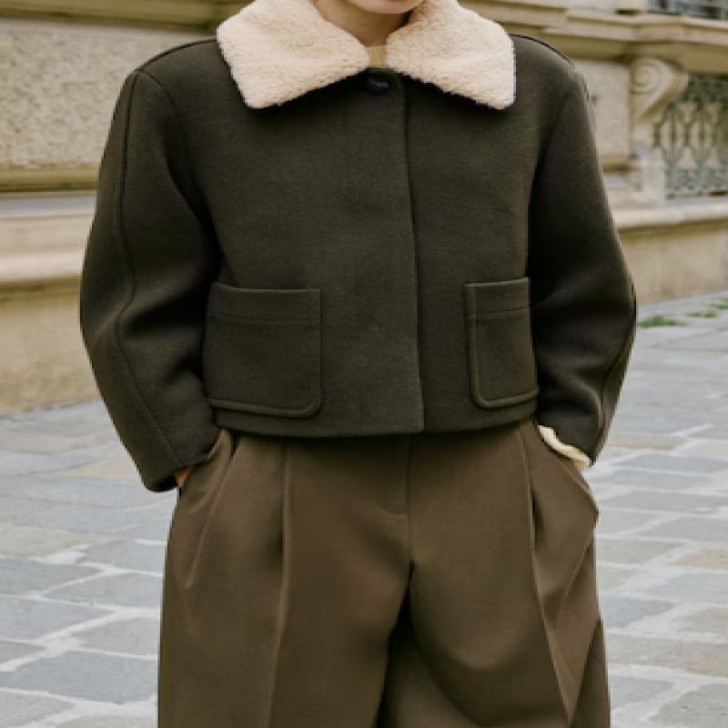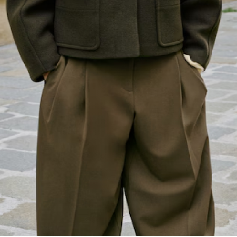 Wideleg tasarım. Sarouel kesim. Orta bel. Pili detaylı. Kemer halkaları. İki yan cep. Düğme, kanca ve gizli fermuarlı ön kapama. İç astar.