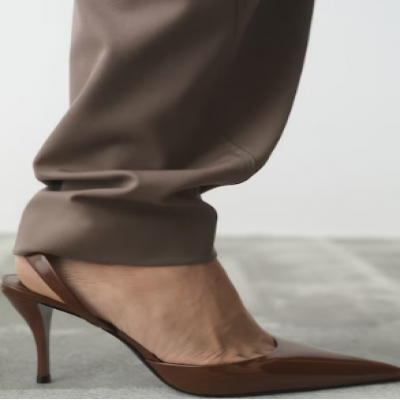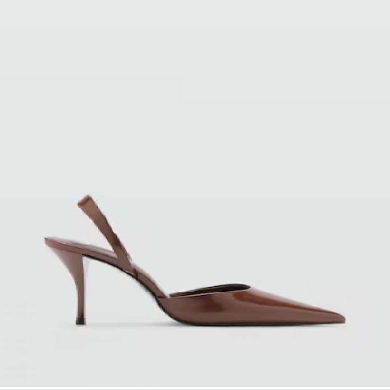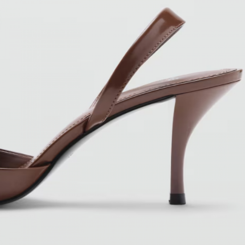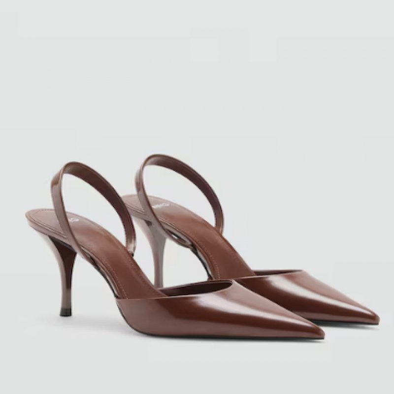 Rugan deri görünümlü. Ucu sivri. İnce topuk. Açık topuk tasarımı.