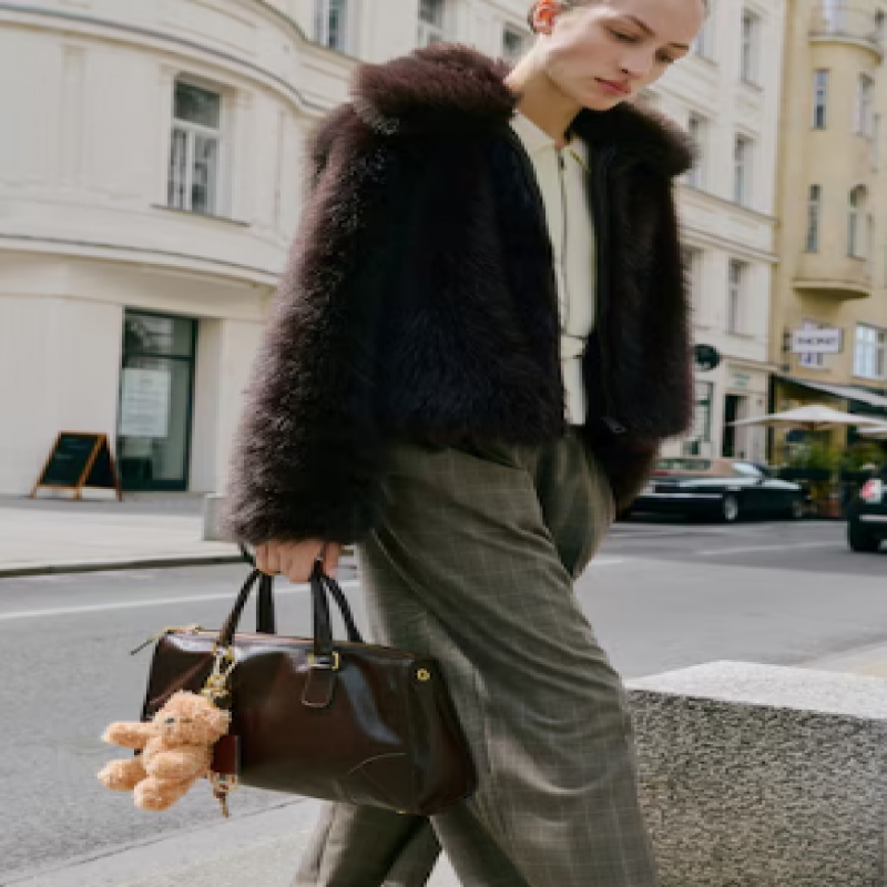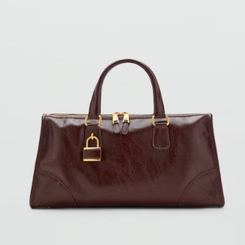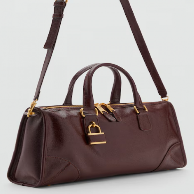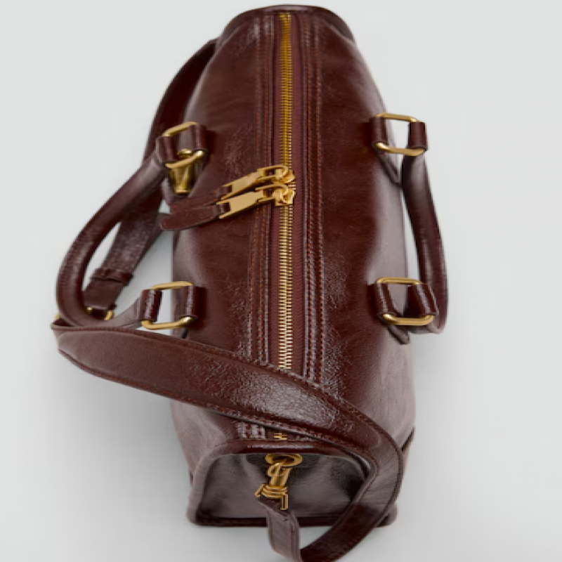 Deri etkisi. Parlak yüzeyli. Dikdörtgen tasarım. İki kısa el kulbu. Çıkarılabilir uzun çapraz askı. Fermuar kapama. Kilit detayı. İç astar.