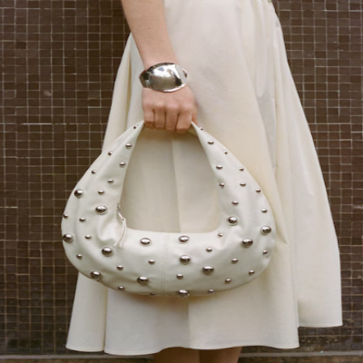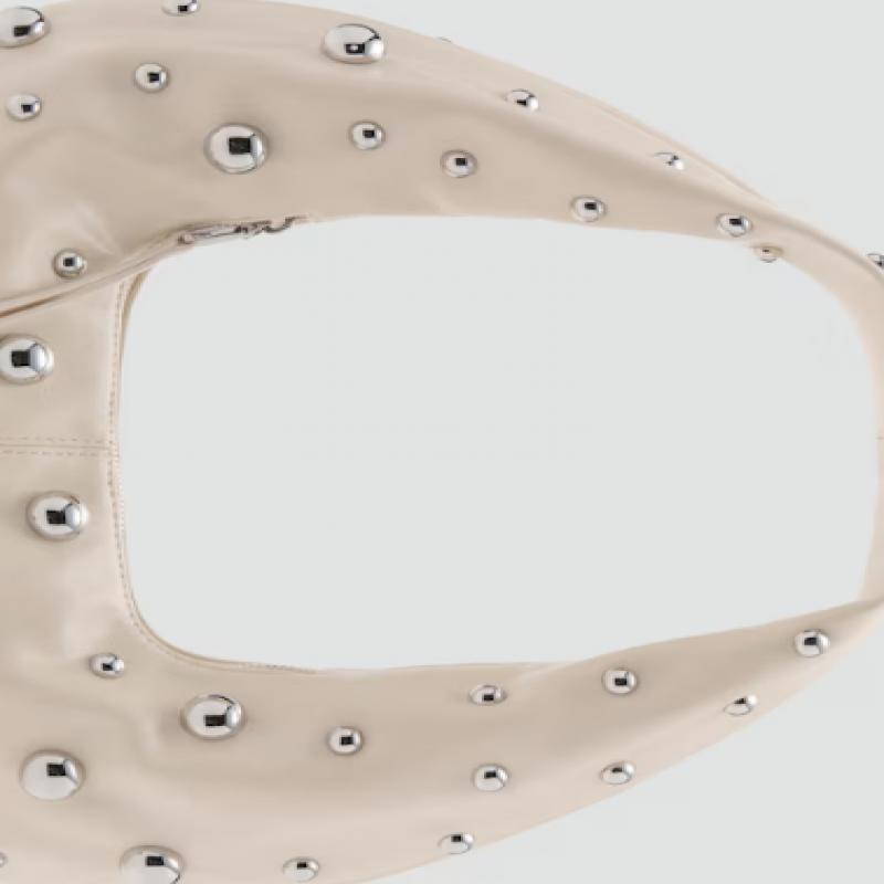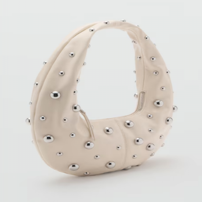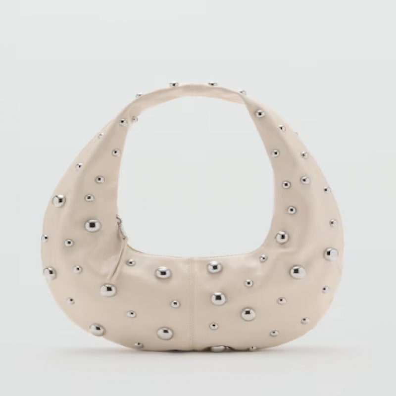 Deri etkisi. Oval tasarım. Omuz askısı. Dekoratif zımbalı. Fermuar kapama.